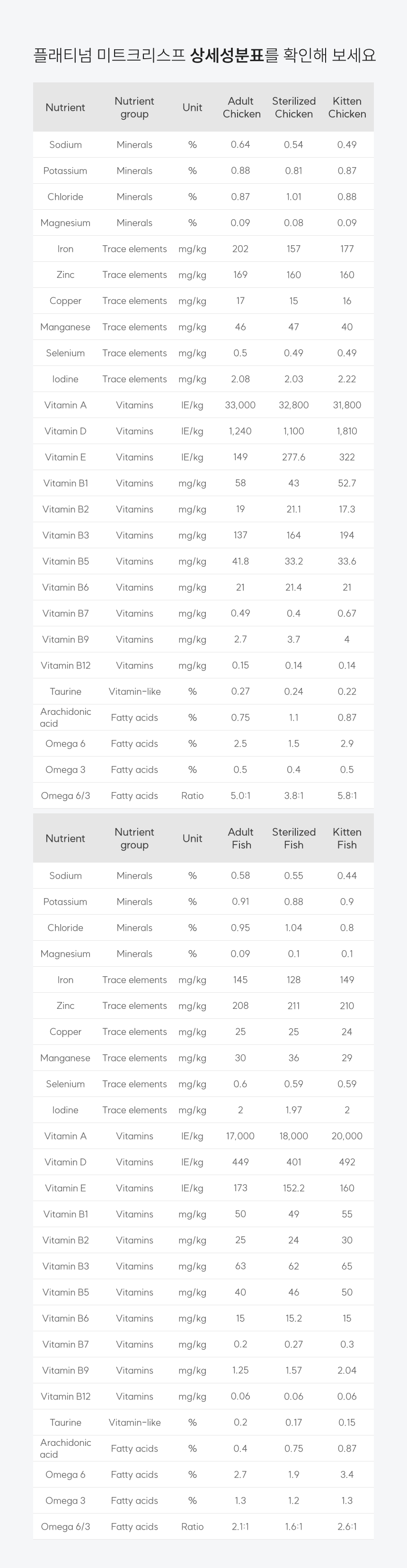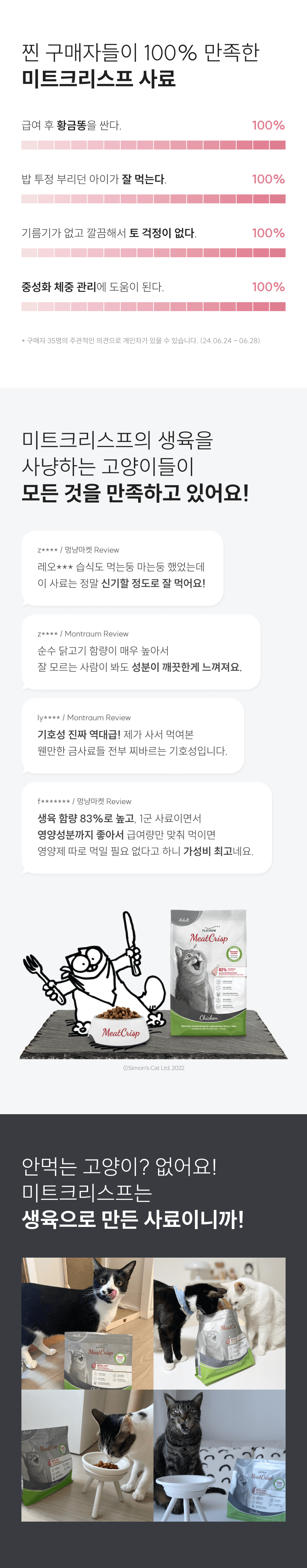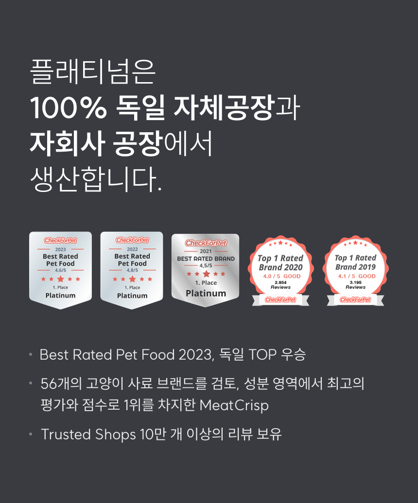 Best Review플래티넘미트 크리스프 샘플_50g까다로운 우리 냥이가 잘먹어요 요즘 사료문제때문에 난리인데 안전한사료라고 믿고 급여해보려구요j*******|2024.04.27리뷰 상세정보 펼쳐보기멍냥마켓 인기제품 리뷰플래티넘플래티넘 강아지 메뉴 습식사료진짜 감사합니다 ㅜㅜ 18살 여왕님 입맛 맞추느냐고 죽을맛인데 플래티넘만 안가리고 잘먹어요.. 안전빵으로 항상 시킬게요 감사합니다 ㅠㅠㅠl*******|2024.04.26카르나4그레인프리 캣 피쉬 0.91kg주식으로 주기에는 가격이 너무 비싸서 저는 간식대용으로 주고 있어요. 가격만 안비싸면 주 사료로 먹이고 싶을만큼 사람이 맡아도 맛난 냄새나고 가루도 많이 없고 기름기도 없어서 좋아요. 다만 아기냥이들이 먹기에는 알갱이가 너무 커용 성묘들이 먹기에 좋은 사료인것 같아요.n*******|2024.04.23카르나4그레인프리 캣 치킨 0.91kg단품으로 줘도 잘먹지만 고단백이라 설사를 해서 베스트브리드를 섞어줍니다! 토핑느낌으로 주고 있어요! 물론 이걸 쏙쏙 골라먹지만요 ㅎㅎㄹ 고소하고 기름기 없는게 좋아오r*******|2024.04.26