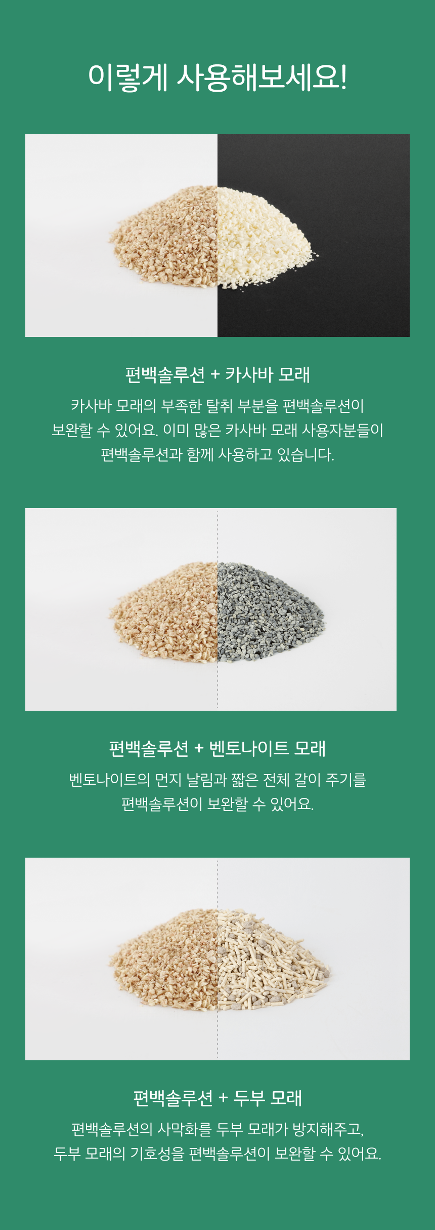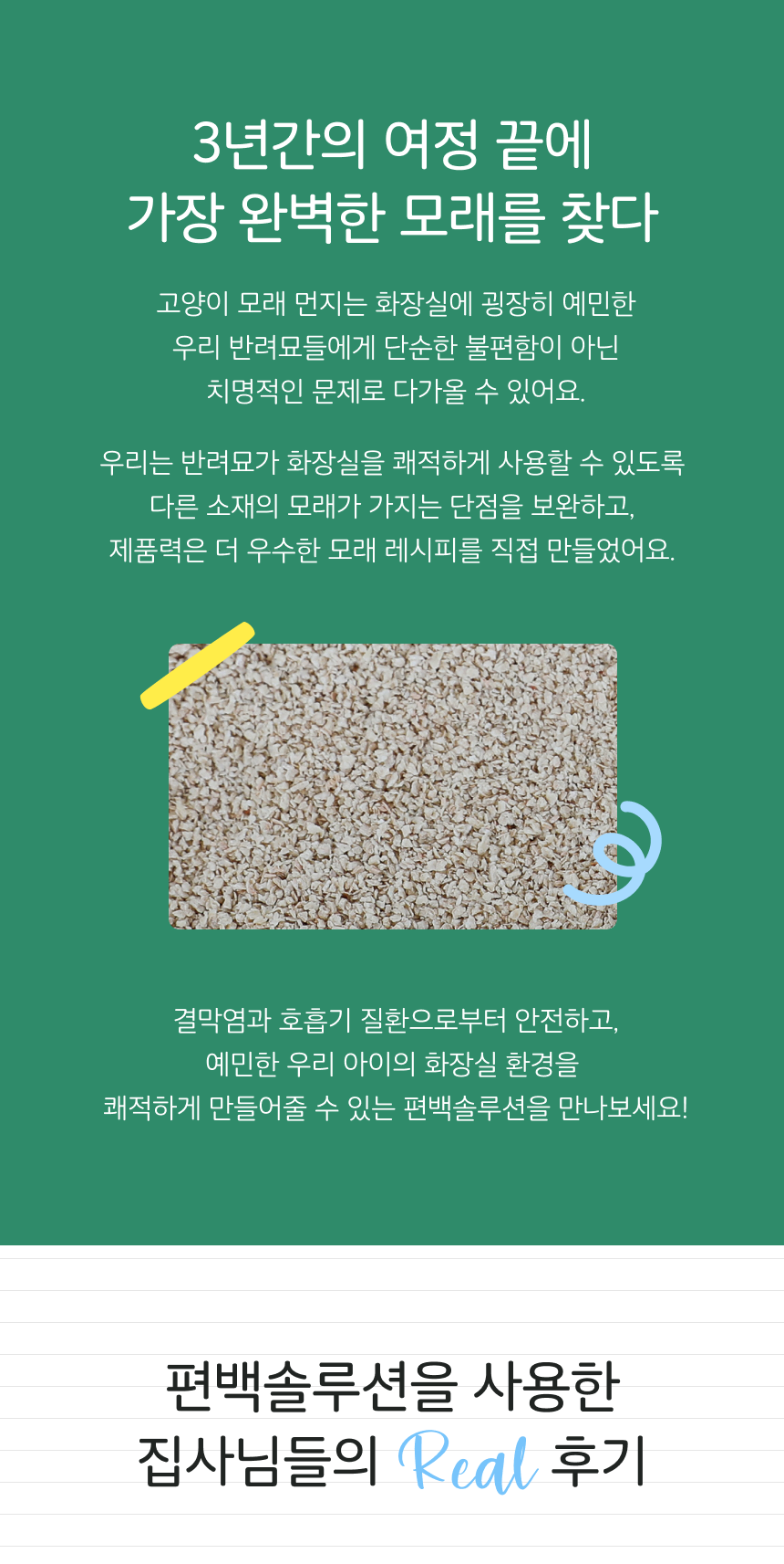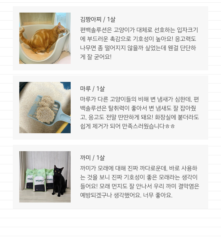 Best Review디그앤롤편백솔루션사실 비싼 제품이어서 다른 모래랑 섞어 쓰고 있어요 벤토보다 잘 뭉치고 냄새도 잘 잡아줘서 좋아요d*******|2023.11.24리뷰 상세정보 펼쳐보기